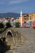 Further inland, and within a few hours of the capital Tirana, is Berati, another well-preserved Ottoman town spreading over several hills and overlooked by a citadel. Berati has an appealing lived-in feel; even the upper town, within the walls of the citadel, is still inhabited. This gives the place a feeling of continuity, rather than the museum-life feeling that pervades some other Ottoman towns in the Balkans. The upper town has always had a strong Christian presence and there are a number of impressive churches. One of them holds a collection of icons by the 16th-century painter Onufri. The town blends into the fertile surrounding valleys, and even in the centre many streets have a canopy of vines, heavy with delicious-looking grapes in August.