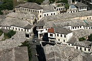 A short distance inland from Saranda is Gjirokastra, one of the most distinctive historic towns in the Balkans. Spread out over several ridges overlooking the Drinos River, and dominated by an imposing castle, is a collection of houses that at first appears typical of Balkan domestic architecture, but on close inspection reveals many unique touches. Seen from the citadel, the grey slate rooftops below seem almost like an organic feature of the countryside.