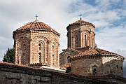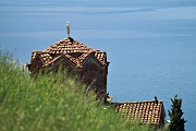 St Clement's monastery was located at Plaošnik, on the wooded slopes below Tsar Samoil's fortress. From a distance the large church of Sv Kliment i Pantelejmon looks like a typical mediaeval Macedonian construction, but on closer inspection it becomes obvious that it is a modern structure - it was consecrated in 2002. Beside it are some remains of an early Christian basilica. A footpath from Plaošnik leads downhill to Kaneo, where the Church of St John perches on a promontory. There's not much to see inside the church, but few visitors to Ohrid can resist taking multiple photographs of the Armenian-influenced exterior with the lake in the background.