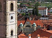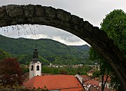 Škofja Loka, located north-west of Ljubljana where the plain gives way to mountains, is Slovenia's best preserved mediaeval town. Most sights of interest are on the south side of the Selščica River, which is crossed by the arched Capuchin (Kapucinski) Bridge. The highlight of the old town is Mestni Trg - like many Slovenian town squares it is more like a wide street than a square and has a Plague Pillar in the middle. Around it are colourful burghers' houses with frescos on the outer walls. Just above Mestni Trg, Loka castle watches over the town - it now houses a museum. To the south of town the more rural Puštal district is a nice place for a stroll - the flowers cultivated by the locals are lovely even by the high standards of Slovenian towns. The Nacetova House, an example of traditional wooden architecture, is in this area. Cross the river and walk uphill to the prominent Sv Križ church for excellent views of Puštal and Škofja Loka.